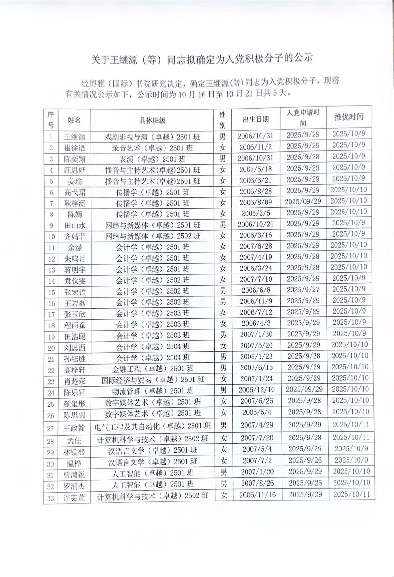 经博雅(国际)书院研究决定,确定王继源(等)同志为入党积极分子,现将有关情况公示如下,公示时间为10月16日至10月21日共5天。